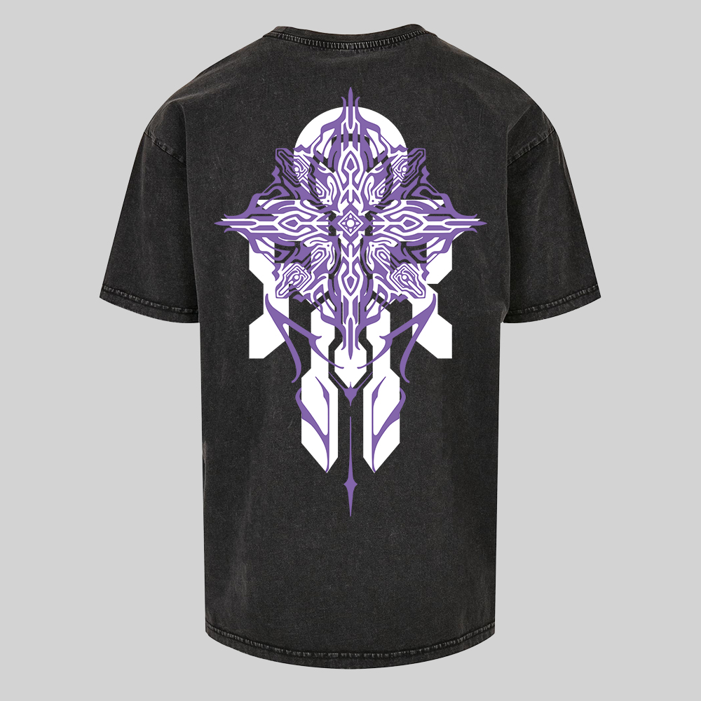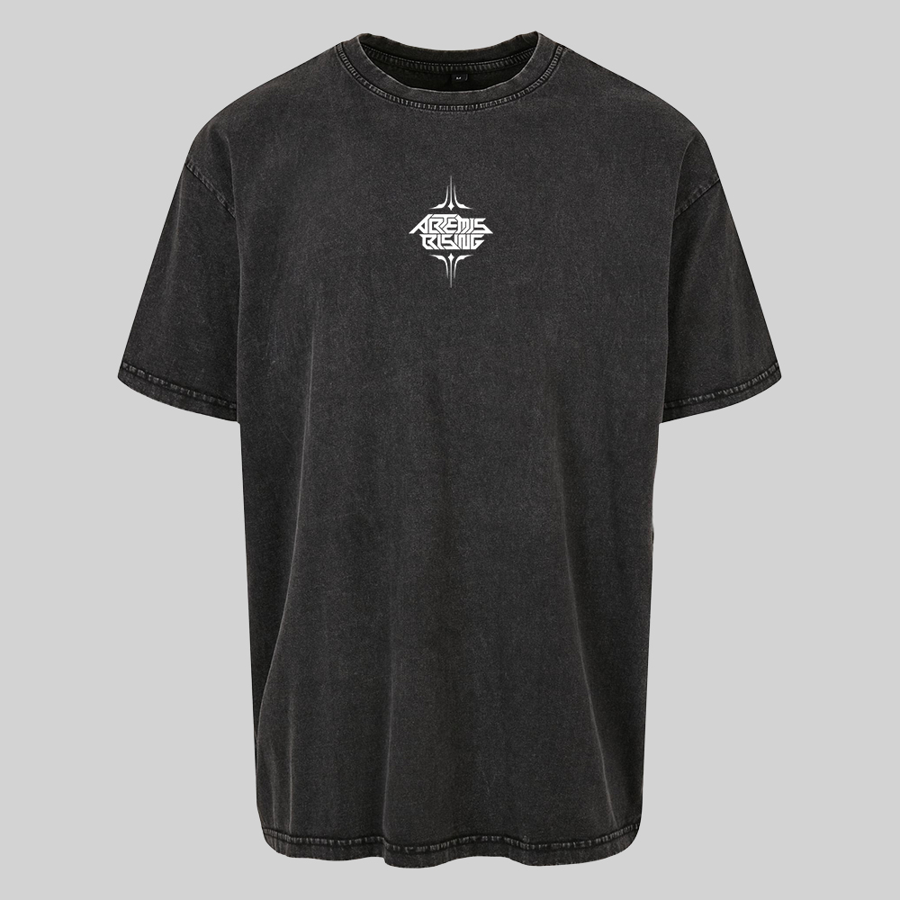 High-quality Artemis Rising T-shirt with a round neckline in stone washed black and a high-quality white front print and white and purple back print.